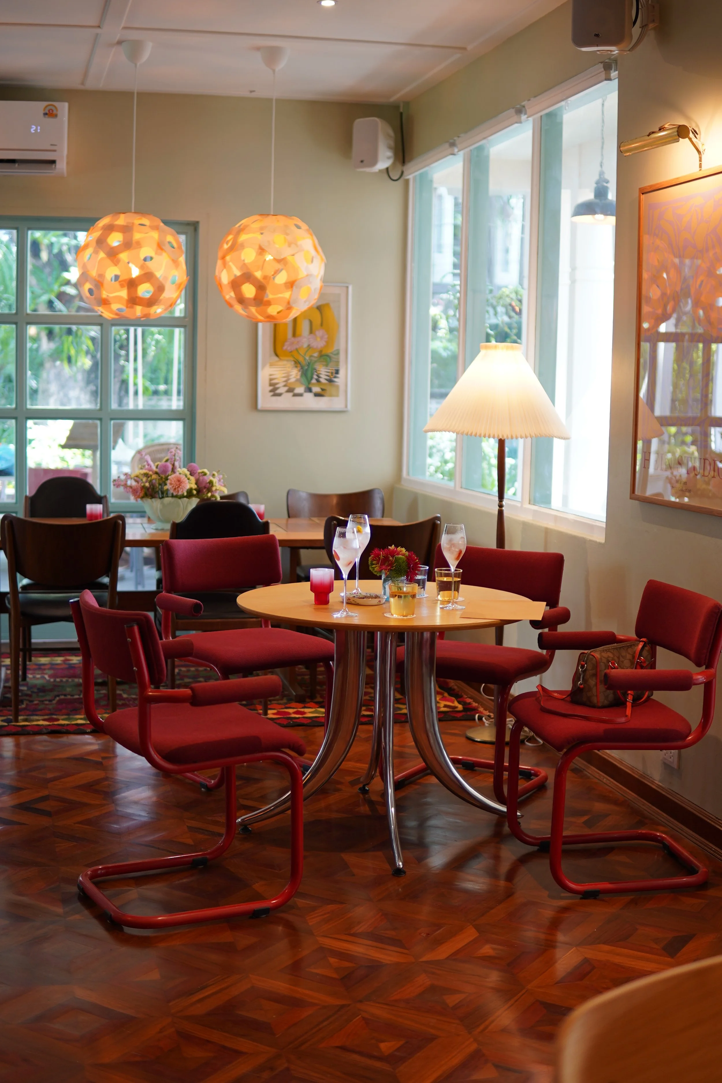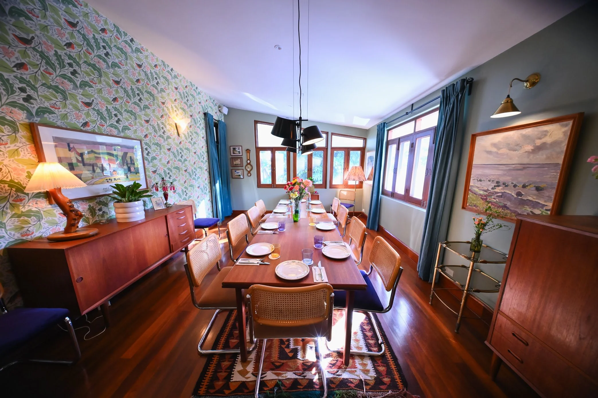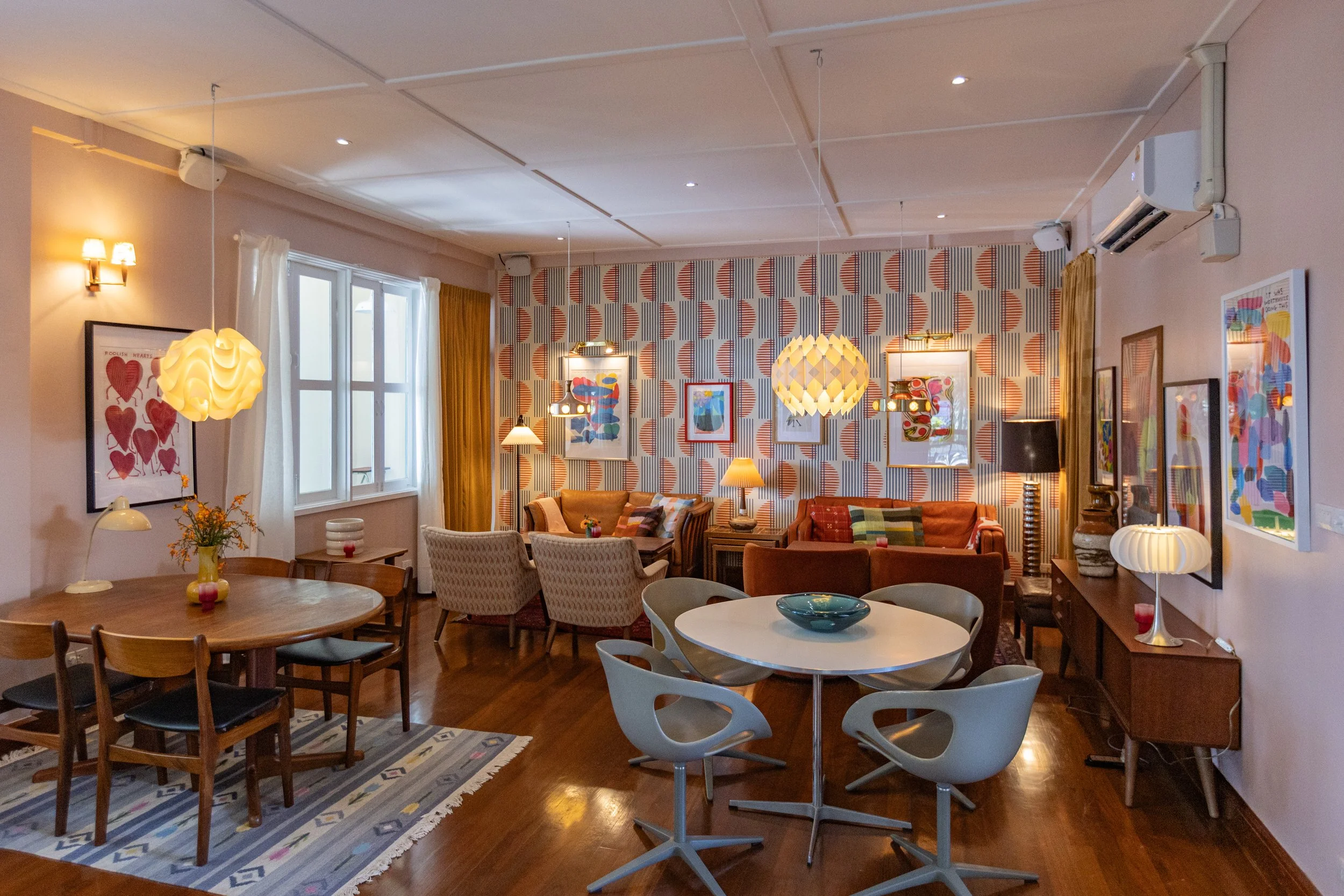 It’s a room that invites slow afternoons and unhurried conversations, surrounded by mid-century furniture, patterned walls, and soft light from the windows.