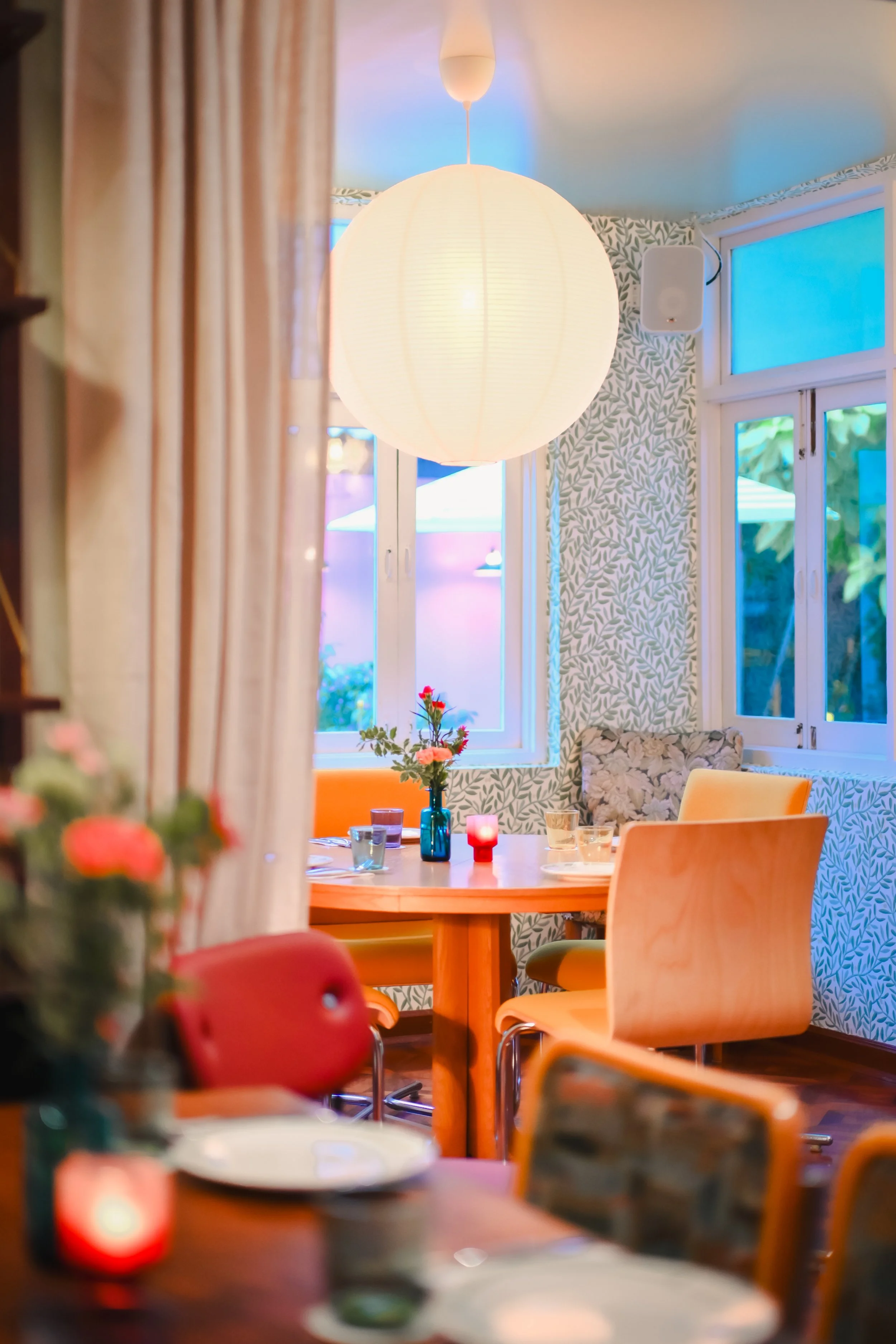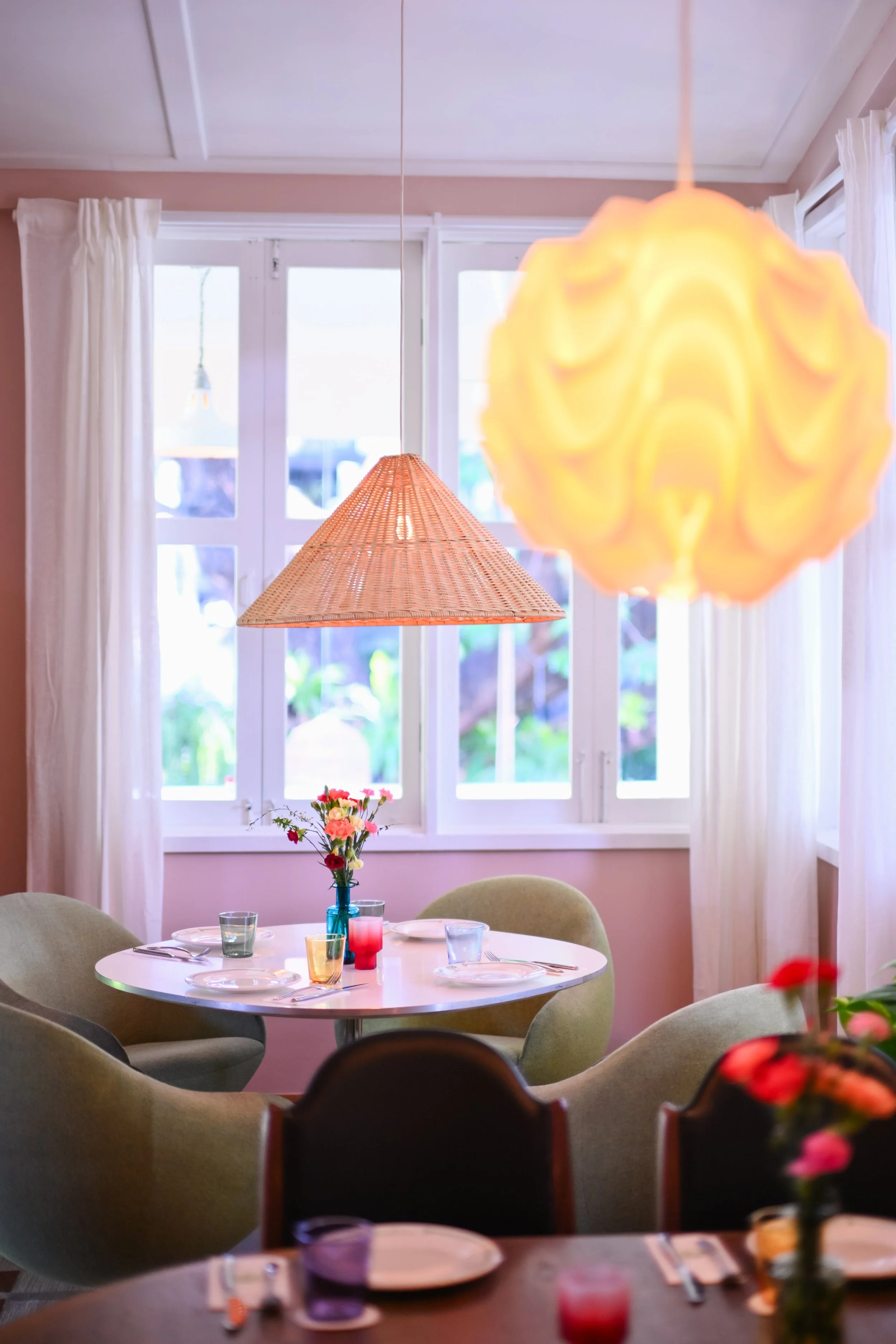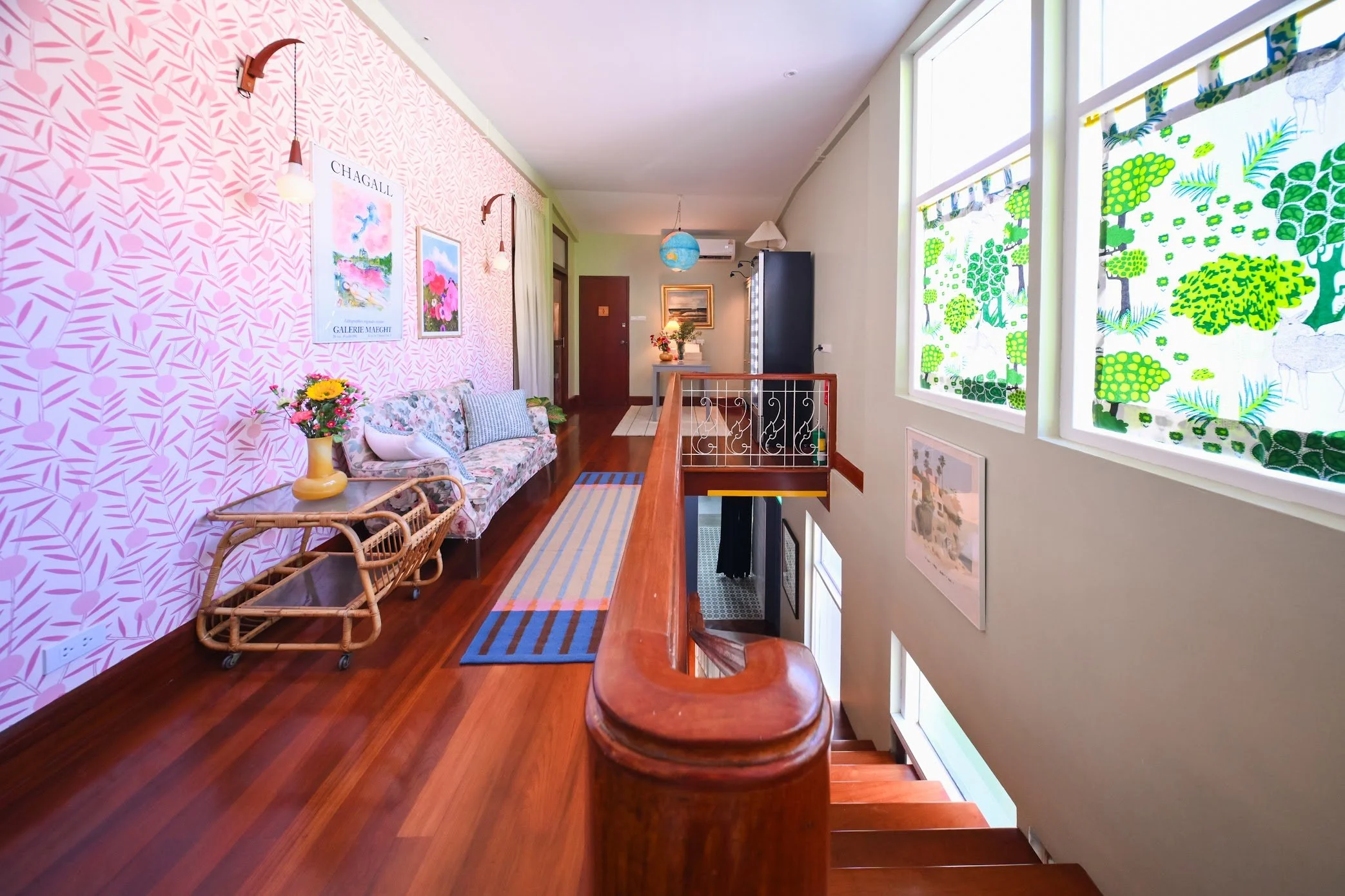 It’s a room that invites slow afternoons and unhurried conversations, surrounded by mid-century furniture, patterned walls, and soft light from the windows.