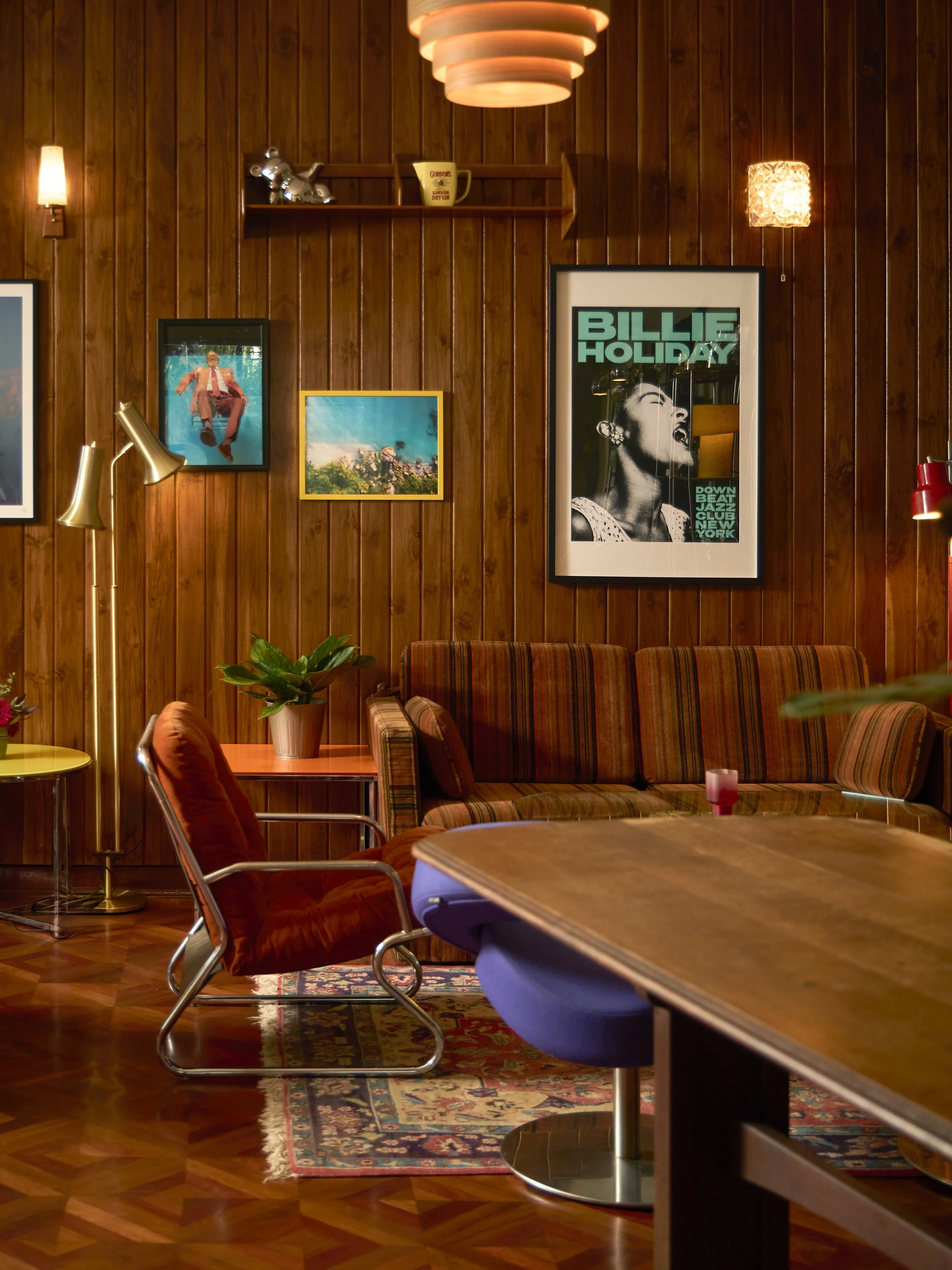 The heart of The House 94 warm light, vintage furniture, and walls lined with art collected from different decades.